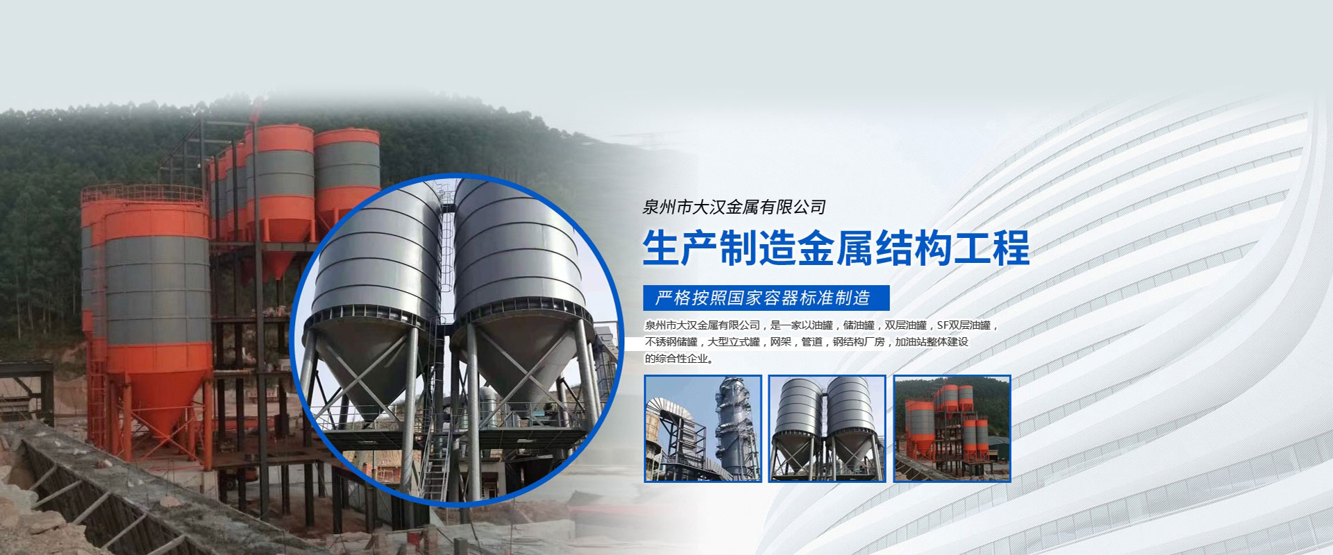 泉州市大漢金屬有限公司,是一家以油罐、儲油罐、雙層油罐、SF雙層油罐、不銹鋼儲罐、大型立式罐、網(wǎng)架、管道、鋼結(jié)構(gòu)廠房、加油站整體建設(shè)的綜合性企業(yè)。本公司以技術(shù)人員、施工經(jīng)驗(yàn)豐富的工程隊、自動化設(shè)備、擁有鋼結(jié)構(gòu)建筑、螺栓球網(wǎng)架設(shè)計安裝技術(shù)力量,嚴(yán)格按照國家容器標(biāo)準(zhǔn)制造,是一家產(chǎn)品開發(fā)并生產(chǎn)各種壓力容器和制造金屬結(jié)構(gòu)工程,化工石油工程安裝的大型企業(yè)。近多年來,以質(zhì)量穩(wěn)定、客戶至上、信譽(yù)為本,以科技求發(fā)展,贏得廣大客戶支持與信賴。